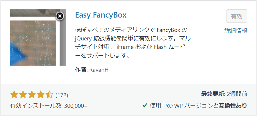 HOMEソフトプラグインEasy FancyBox Easy FancyBox 投稿日:2022-09-11 投稿者:PS カテゴリ:プラグイン 画像をポップアップ表示させるWordPressプラグイン。 プラグインのインストール、有効化。ポップアップさせたい画像を選択し、リンクを「メディアファイル」にする。
