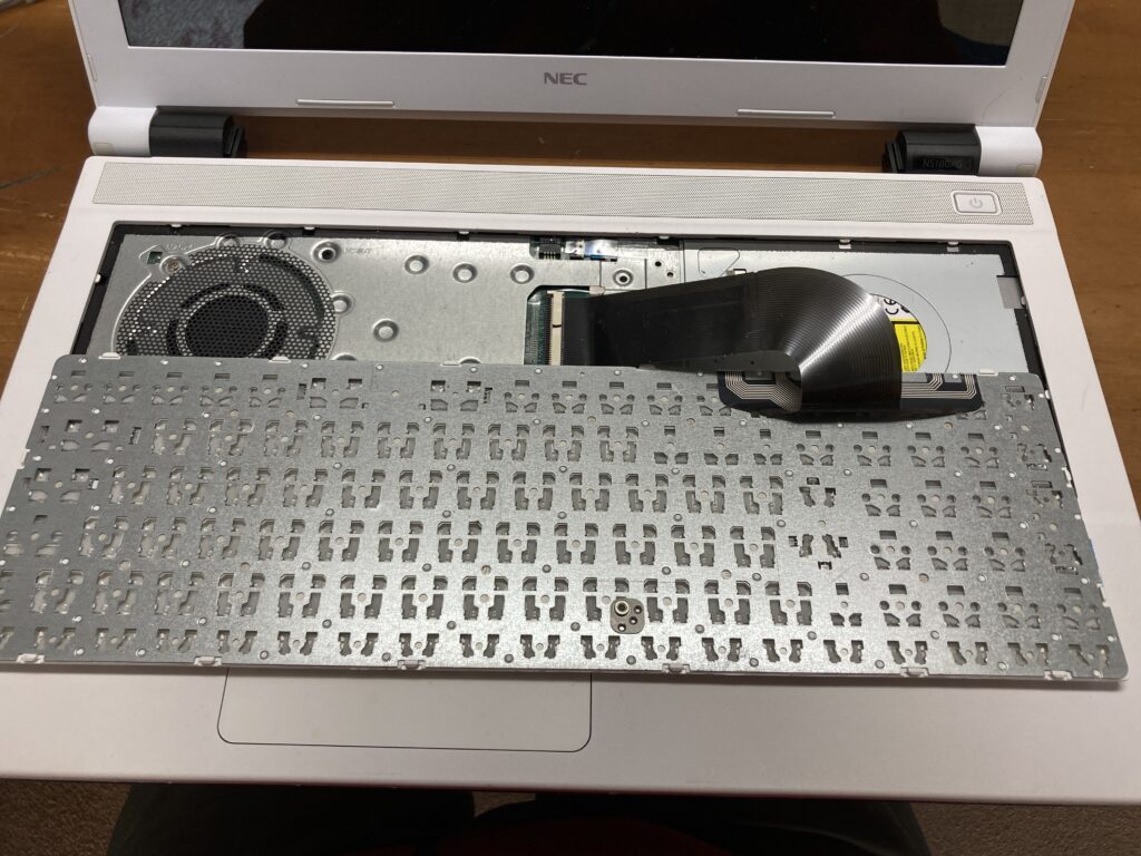 HOMEハードPCNEC LaVie NS100/G NEC LaVie NS100/G 投稿日:2022-12-08 投稿者:PS カテゴリ:PC タグ: NEC 2017年春モデル LAVIE Note Standard NS100/G2W,NS100/G1W 仕様 (ノートパソコン)|NEC LAVIE公式サイト HDD交換手順 きーぼどを固定しているボルト PC背面の、キーボードを固定しているボルトを外す。 キーボードを外す キーボード上部(画面側)の「ヘラ」で手前へこじ開けながら外す。 キーボードに隠れていた部分のネジ(4本)を外す。(接続ケーブルに注意) キーボードと本体の接続ケーブルを外す。(硬くて外せない場合は、外さなくていい) キーボードに隠れていた部分の手前のタッチパッドのケーブルを外す。