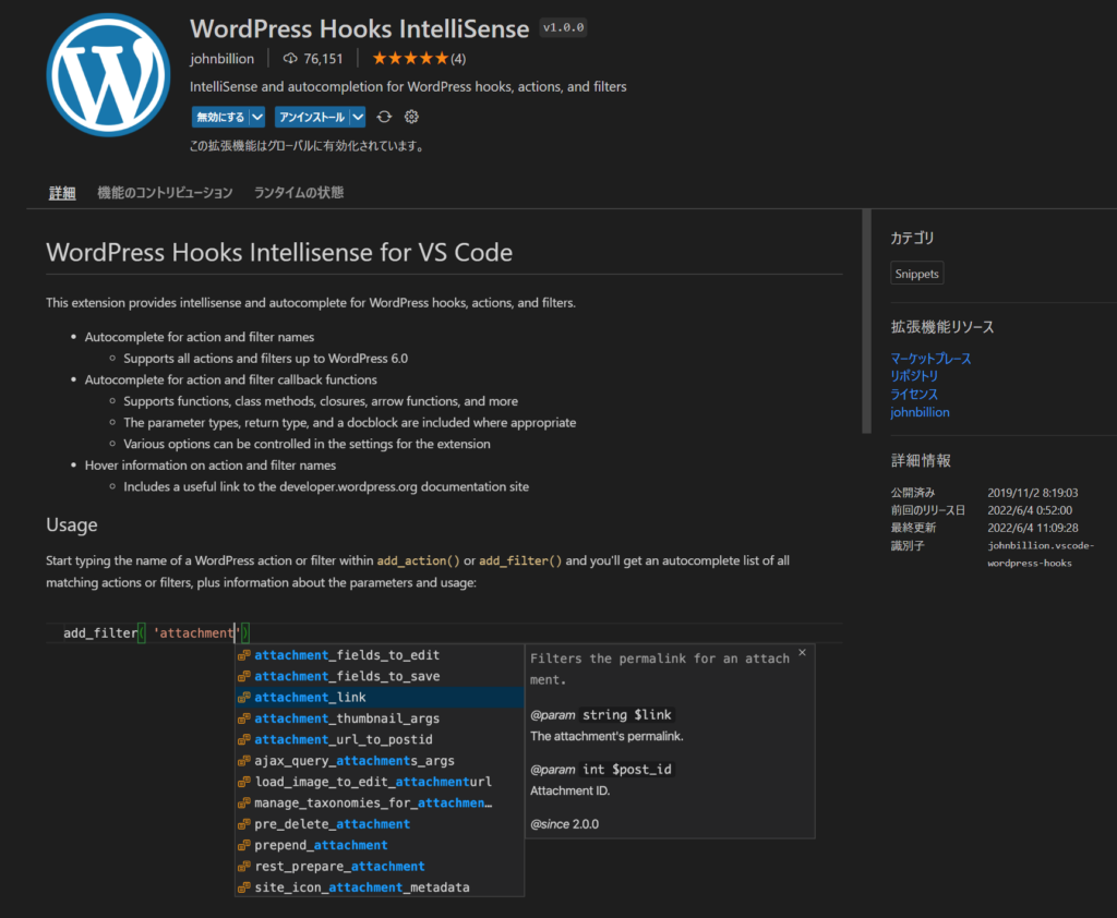 HOMEその他WordPress Hooks IntelliSense WordPress Hooks IntelliSense 投稿日:2022-10-15 投稿者:PS カテゴリ:その他 タグ: VSCode, WordPress, 拡張機能 インストールするだけで特に設定の必要はない。