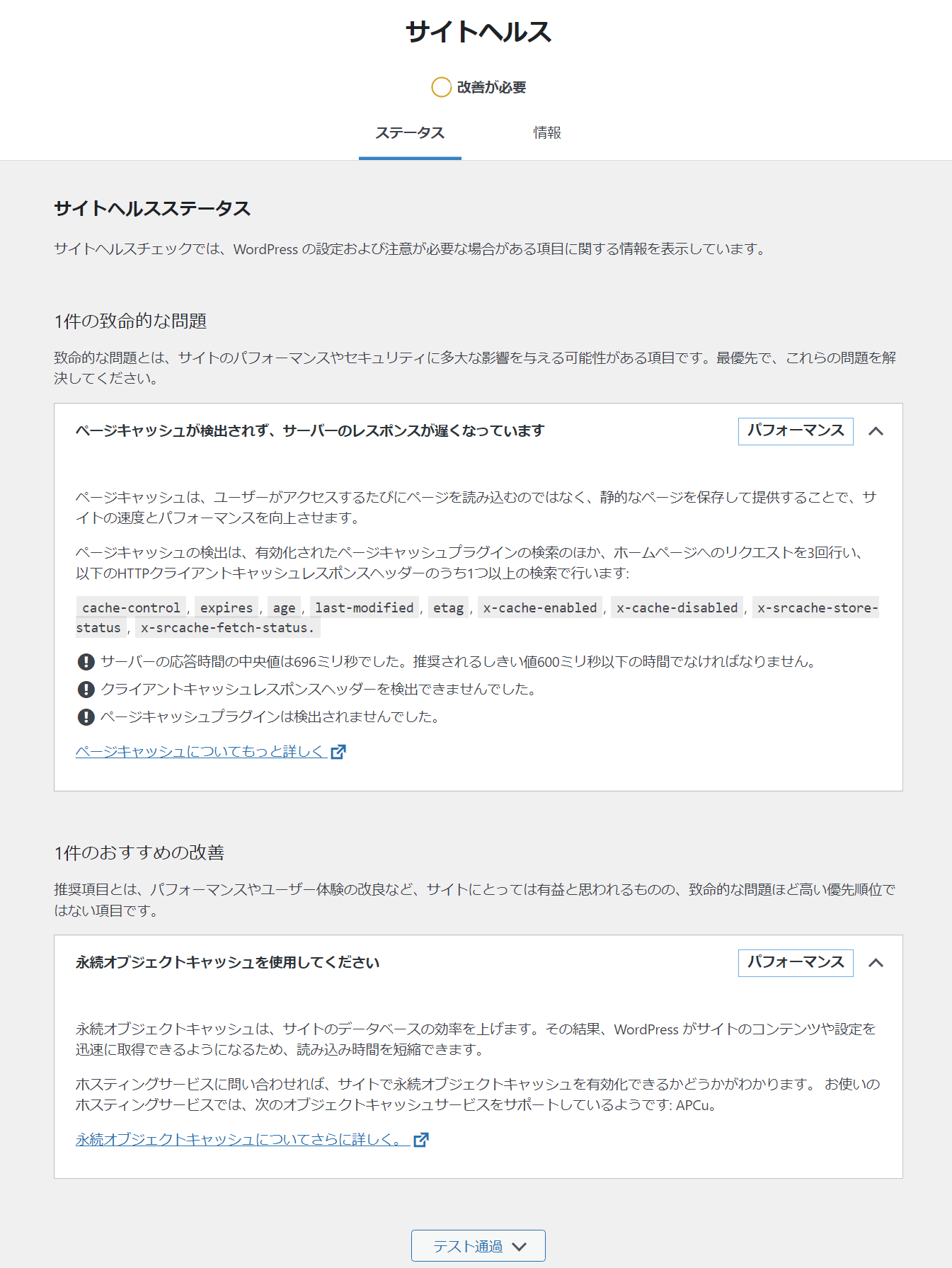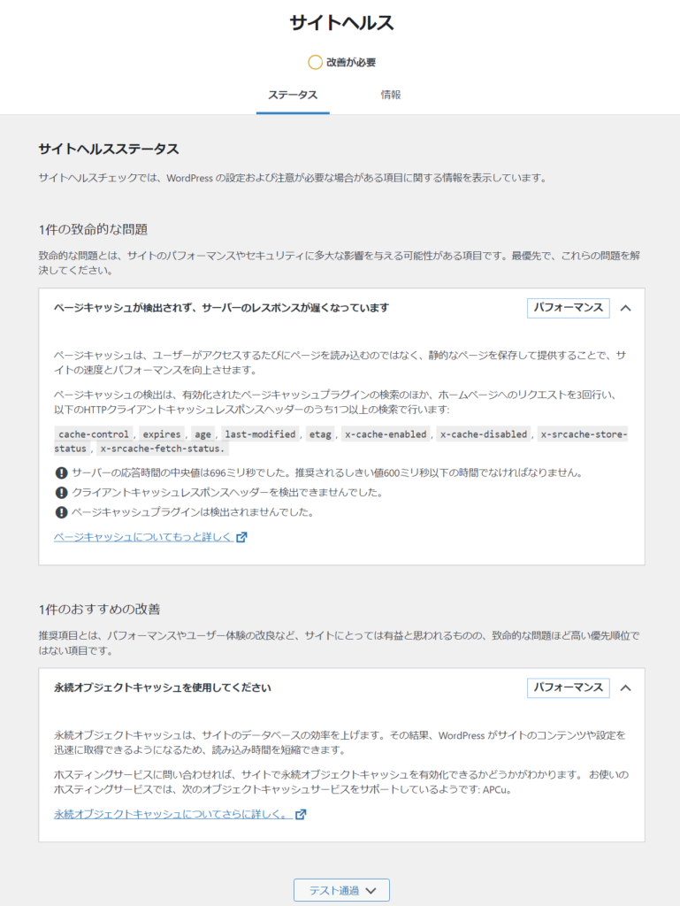 WordPress 6.0 からサイトヘルスで「ページキャッシュ」の警告が表示されるようになった。
