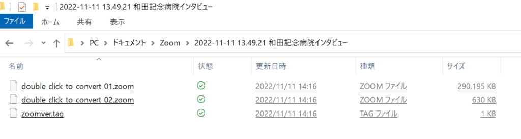 .zoom ファイルは、録画中に一時保存されているファイルで、録画終了後、自動的に .mp4 .m4a に変換される。何らかの理由で変換が中断されて、.zoom データだけしかない場合、.zoom をダブルクリックすることで、mp4 .m4a に変換される。
